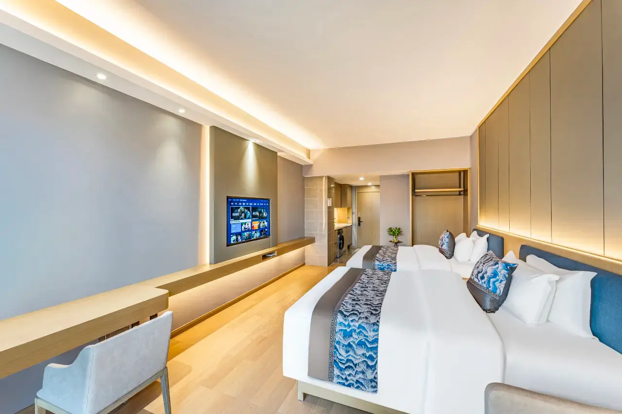 Discover the perfect blend of style and practicality in the 轻奢双卧房 at 逸铂酒店(珠海拱北口岸富华利店). Situated within the vibrant Fuli Xintiandi complex in the Xiangzhou District, this room is meticulously designed for friends, families, or business colleagues who value both comfort and a touch of modern elegance.